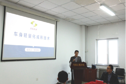 随后,致力于车身轻量化研究的材料学院初冠南教授被邀请做专题介绍,他讲解了自己目前的科研状况,展示了自己的科研成果在车身轻量化方面的应用,并与几位专家就当前该技术的研究现状和可行性做了充分探讨。