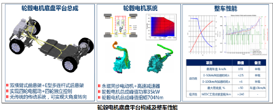 轮毂电机纯电动汽车底盘平台是中国一汽首款分布式轮毂电机驱动底盘平台,由双横臂前悬架、多连杆后悬架及轮毂电机系统组成,搭载分布式整车驱动控制技术,提高整车运动性能。