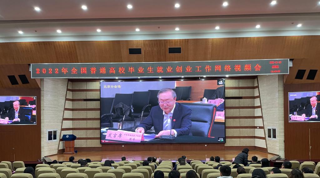 11月19日,教育部、人力资源社会保障部召开2022届全国普通高校毕业生就业创业工作网络视频会议。教育部党组书记、部长怀进鹏,人力资源社会保障部党组成员、副部长李忠出席会议并讲话,教育部党组成员、副部长翁铁慧主持会议。国家发展改革委、工业和信息化部、财政部、国务院国资委、国家统计局、中央军委国防动员部、共青团中央有关部门负责同志参加会议,各省、各普通高校设分会场共计12.5万人参加会议。学校党委书记王官成,党委副书记、院长郭天平,党委委员、副院长赵柏森,教务处、学生处、校团委、安稳办相关负责同志,各二级学院党总支书记、院长、就业干事,毕业班辅导员,招生就业处相关人员在学校分会场参加了会议。