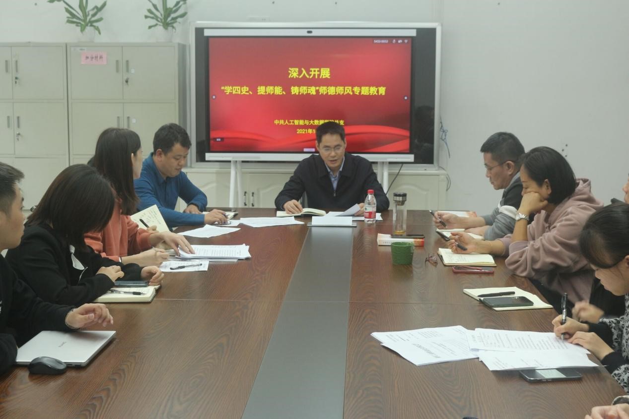 日前,为庆祝建党100周年,深入开展“四史”学习教育,进一步加强师德师风建设,学校人工智能与大数据学院在第三教学楼开展“学四史、提师能、铸师魂”师德师风专题教育座谈会。学校党委委员、纪委书记颜正主持会议,人工智能与大数据学院党总支书记唐腾健、副院长李淼及教师代表参加会议。
