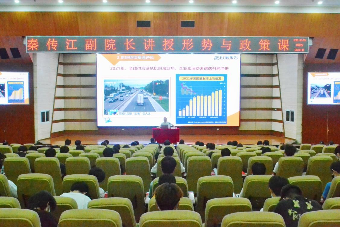 秦传江副院长从“崎岖不平的复苏之路”“影响复苏的多重因素”“促进复苏的中国动力”三个方面深入阐述了当前中国和世界经济的现状。他讲到,中国是世界经济复苏的稳定器和动力源,作为世界第一大消费市场和第一大贸易国,中国在有效控制疫情和迅速恢复经济方面表现出了高效的执政能力,在提振世界经济方面发挥了重要作用。他进一步讲到,作为新时代大学生要科学分析世界形势和我国发展大势,坚持用全面、辩证、长远的眼光看待当前的困难、风险、挑战,认识我国经济稳中向好、长期向好的基本趋势。