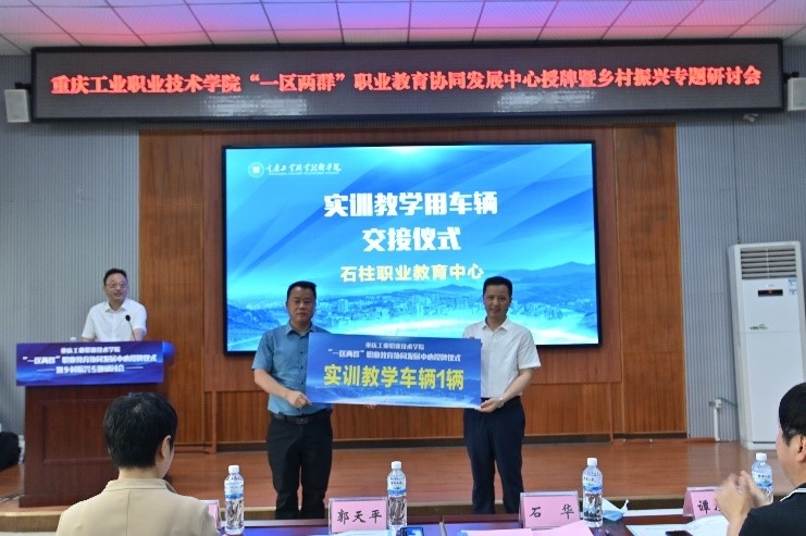 学校院长郭天平与石柱县副县长石华交接石柱中心实训教学用车辆
