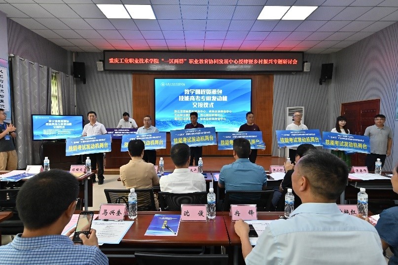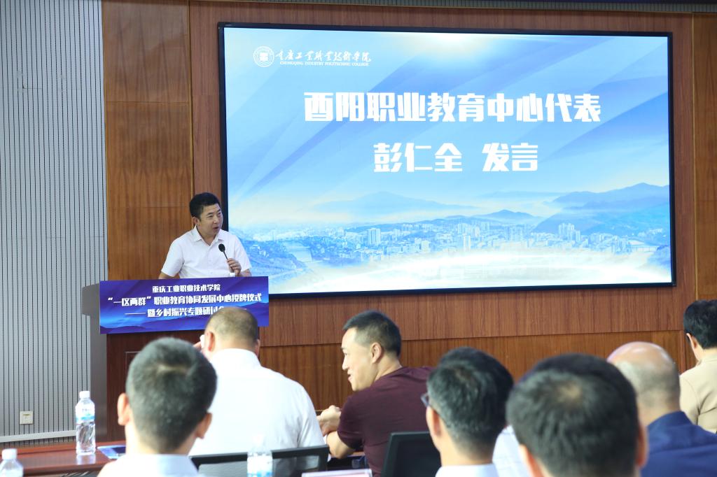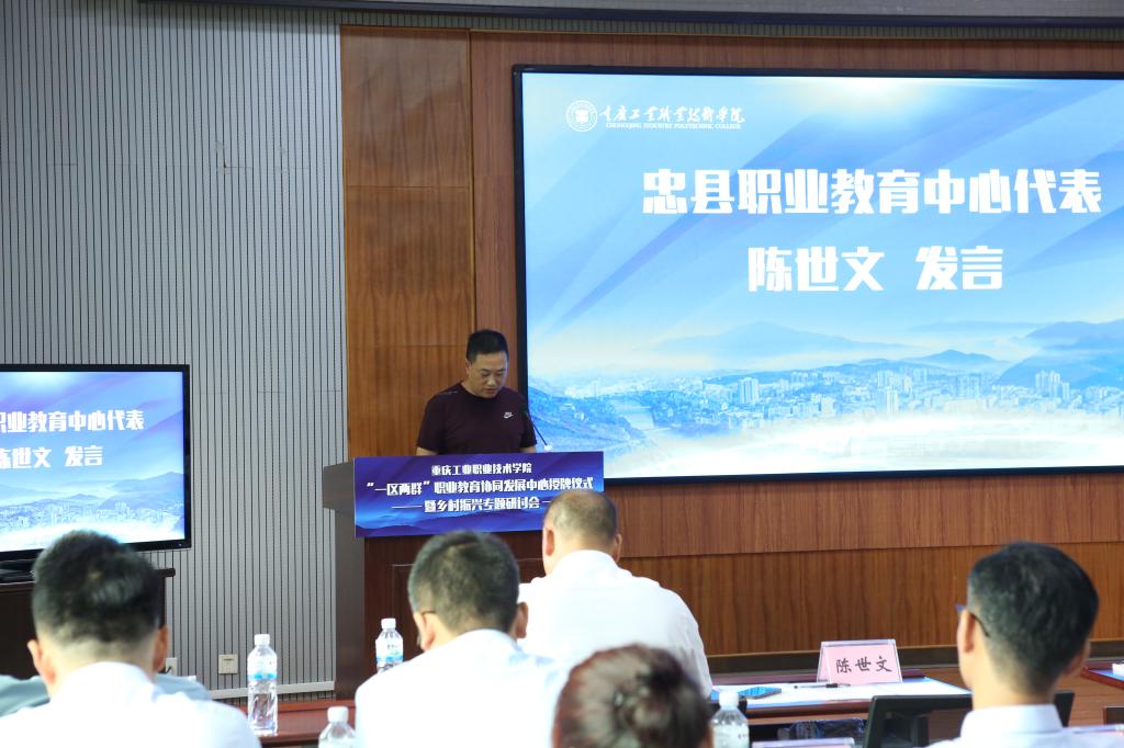职业教育协同发展院校代表彭水县职业教育中心副校长陈家斌作题为“以帮扶支援,携手共赢促发展”的发言。他讲到,重庆工业职业技术学院与彭水职教中心签订的校际对口帮扶协议中,对帮扶学校的管理和师资水平、专业和课程建设、教学高质量建设等方面进行了一对一的帮扶指导。一是拓宽升学渠道,开展“3+2”合作办学;二是帮扶优质专业,共建共享资源;三是落实立德树人根本任务,建立课程思政教学研究分中心;四是提升双优质量,共同开展科研合作;五是打造师资队伍,培育技能大师名师。陈家斌副校长表示,通过重庆工业职业技术学院的精准结对帮扶,彭水职教中心将坚持“请进来”和“走出去”相结合,积极促进职教中心与重庆工业职业技术学院的专业人才与学生互动双向交流,培育更多区域需求人才,共同续写高质量发展的新篇章。