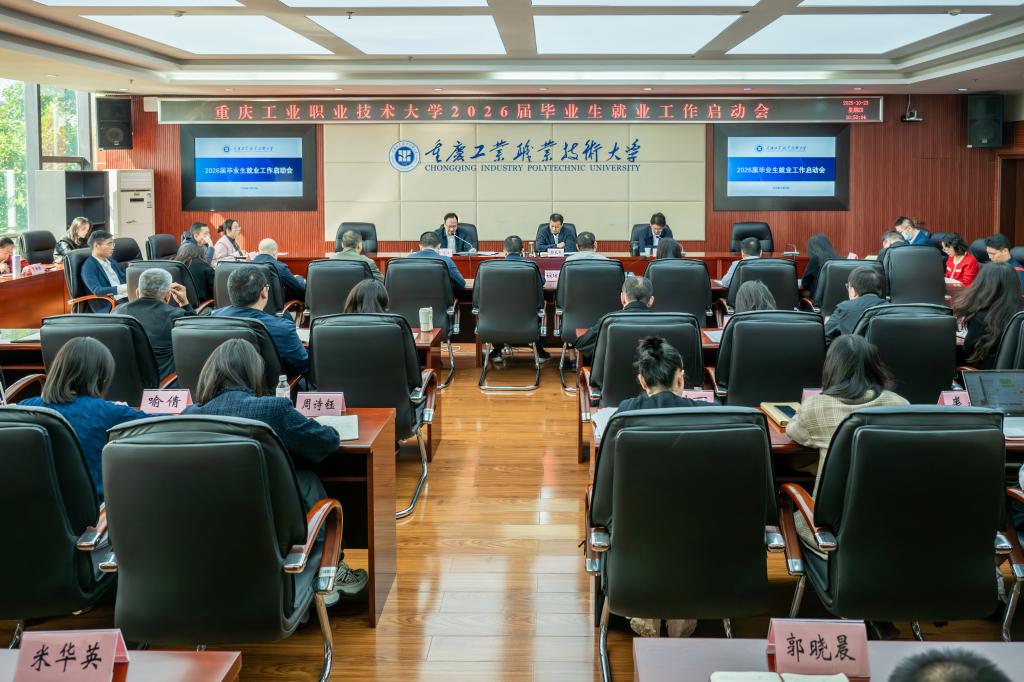 10月23日,2026届毕业生就业工作启动会在渝北校区召开。学校党委书记郭天平,校长周传德,副校长秦传江,招生就业处、学生处相关职能部门负责人和各二级学院党总支书记、院长、就业干事及全体毕业班辅导员参加会议。会议由秦传江主持。