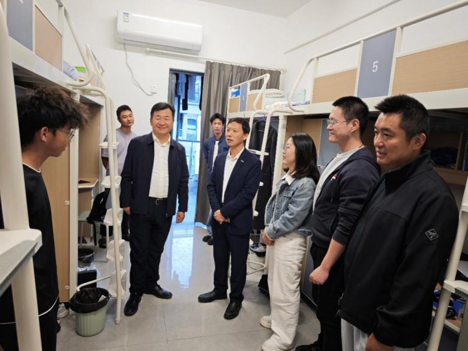 张荣走访了辅导员办公室并与辅导员们亲切交流,详细询问新生思想动态、日常管理及学业情况。他对辅导员们的辛勤付出表示感谢并指出,辅导员要主动贴近学生,精准掌握学生需求,做实做细思想引导和生活关怀,为新生扣好大学生活“第一粒扣子”,帮助他们平稳度过适应期,为今后成长成才打下坚实基础。随后,张荣深入学生寝室,实地察看了住宿环境以及生活设施配备情况,了解了同学们当前学习与生活需求。他勉励同学们要珍惜宝贵的学习时光,尽快完成从中学生到大学生的角色转变,科学规划学业,注重培养自主学习能力和团结协作精神,在南川新校区度过充实又精彩的大学生活。