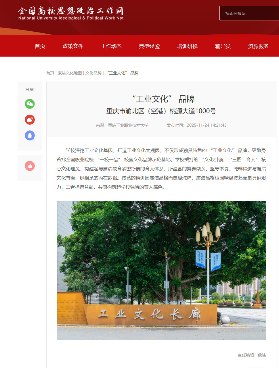 为深入贯彻落实新时代廉洁文化建设要求,聚焦立德树人根本任务,深化新时代高校廉洁文化建设,日前,教育部组织开展了第十届高校廉洁教育系列活动。我校精心打造的“工业文化”品牌与“再读红岩”教育实践中心,凭借深厚的文化底蕴、鲜明的育人特色和显著的育人成效,成功入选全国高校廉洁文化地图库,并在全国高校思想政治工作网“廉洁文化地图”中展播,作为国家优质教育资源向全国推广。
