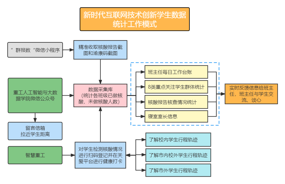 当前,重庆疫情传播范围广、感染程度深,疫情仍处于高位、呈上升趋势,防控形势依然复杂严峻。为高效地开展疫情防控工作,精准做好学生信息数据排查,学校人工智能与大数据学院充分发挥专业优势,利用新时代互联网技术创新学生数据统计工作模式,加强对校内外学生的数据摸排力度,以技术创新助力疫情防控科学化。学院利用微信公众号,建立了疫情数据采集库,以班级为单位实时统计各班级已做核酸、未做核酸人数,也可支持复查记录,有效避免了各班级单独提交文件出现重复、混乱的弊端。开通留言信箱及时掌握学生情况,拉近与学生的距离。同时,还建立了班主任每日工作台账、8类重点关注学生群体统计表、寝室室长信息表、核酸报告核查情况表等,有效实现了数据统计“足不出户”。依托疫情数据库还能精准收取核酸报告截图和渝康码截图,能够全面准确掌握学生的疫情排查情况,为学院做好疫情监测、排查、预警等防控工作提供坚实有效的智能保障。此外,人工智能与大数据学院还坚持使用智慧重工——学生关爱平台进行健康打卡,及时了解学院校内、市内校外和市外学生的行程轨迹。