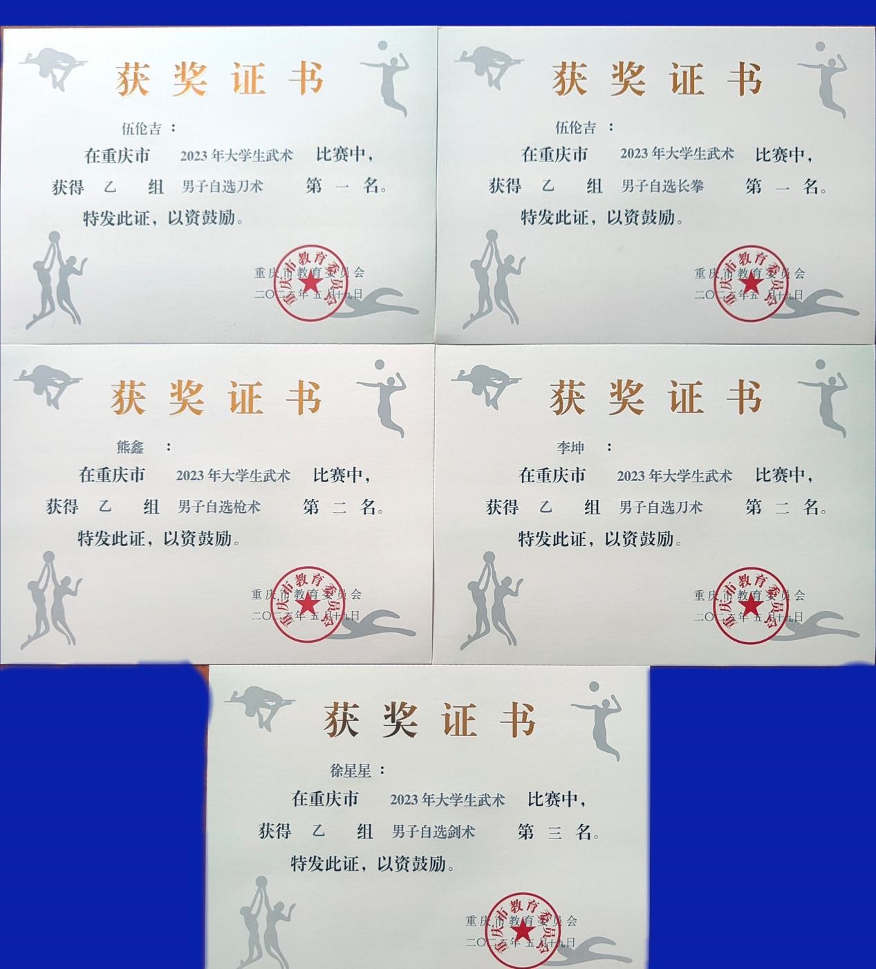 日前,重庆市大学生武术比赛在重庆师范大学顺利举办。学校武术代表队在领队秦虎、教练员李艳老师和袁琴老师的带领下,最终取得了2金2银1铜的好成绩,学校获得体育道德风尚奖。