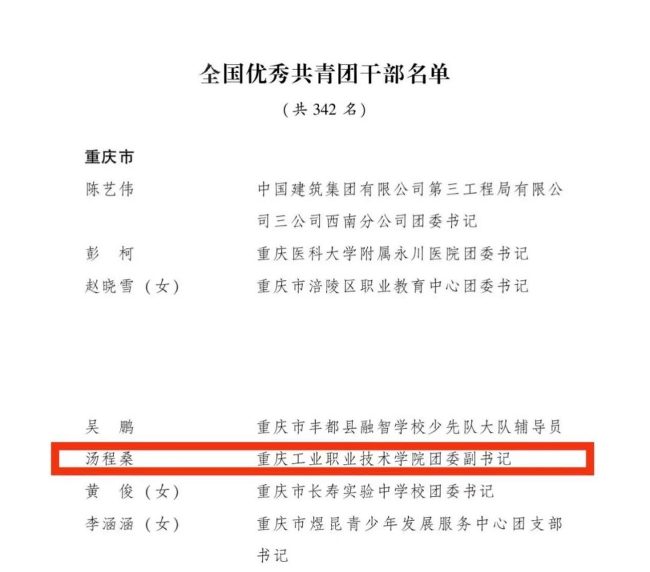 日前,共青团中央授予342名同志全国优秀共青团干部称号。学校团委副书记汤程桑获评全国优秀共青团干部称号。本次表彰严格审查参评资格和评选条件,坚持从严审核、优中选优,注重在重大斗争、重大项目、重大事件中表现突出的组织和个人进行激励。受表彰的集体和个人有来自各大中院校、企事业单位、党政机关、城乡社区、社会组织和解放军等各领域,具有广泛的代表性。