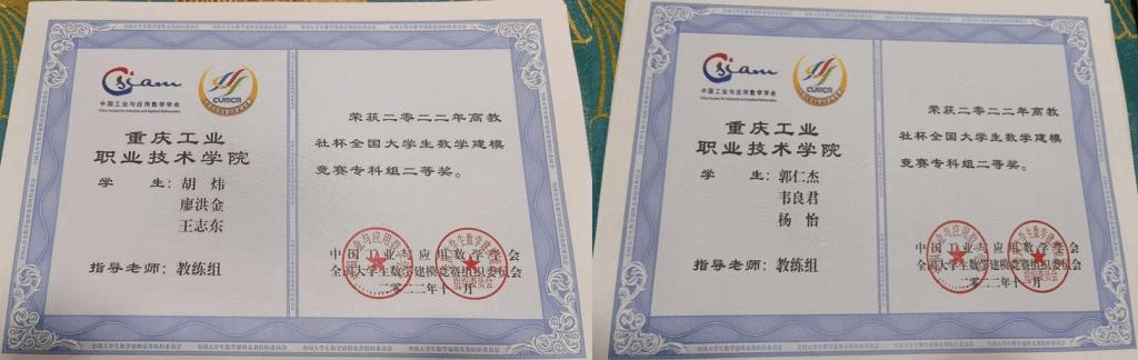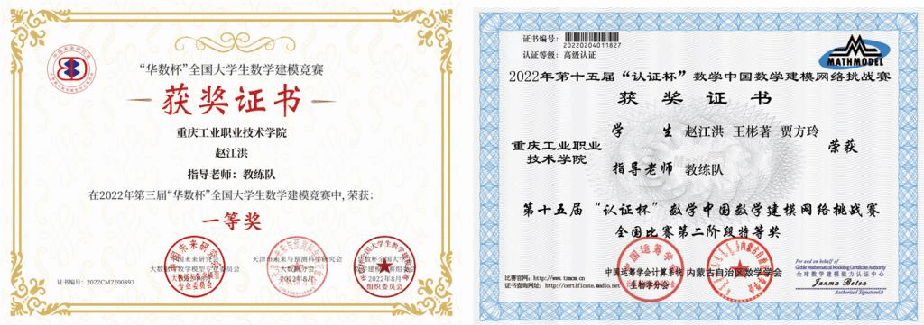 今年8月和11月,我校学生赵江洪、王彬著、贾双玲荣获第三届“华数杯”全国大学生数学建模一等奖,第十五届“认证杯”数学中国数学建模网络挑战赛全国比赛第二阶段特等奖;学生郭仁杰、韦良君、杨怡、胡炜、廖洪金、王志东获得“高教社杯”全国大学生数学建模全国二等奖2项,重庆市一等奖7项,重庆市二等奖5项,我校被评为重庆赛区“优秀组织工作单位”。
