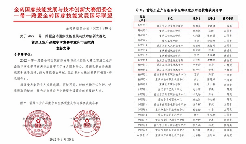 日前,由金砖国家工商理事会、教育部中外人文交流中心等联合主办,我校承办的2022一带一路暨金砖国家技能发展与技术创新大赛首届工业产品数字孪生赛项重庆市赛顺利召开。我校设计学院教师李传帅、陈冲荣获教师组一等奖,教师郭一可、董博获得教师组二等奖,学生易囿名、黄锖培荣获高校组一等奖。