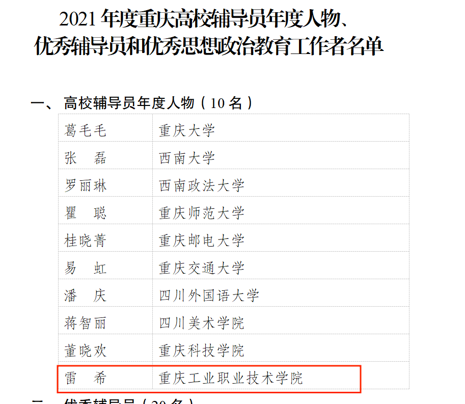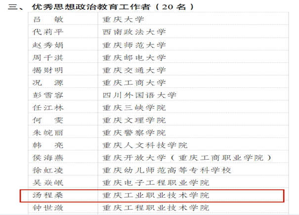 近日,重庆市教育委员会发布了《重庆市教育委员会关于2021年度高校辅导员年度人物优秀辅导员和优秀思想政治教育工作者评选结果的通报》(渝教宣函〔2022〕14号),我校人工智能与大数据学院辅导员雷希被评选为2021年度重庆高校辅导员年度人物,是今年唯一获评该称号的高职类院校辅导员,校团委副书记汤程桑被评选为2021年度重庆高校优秀思想政治教育工作者。