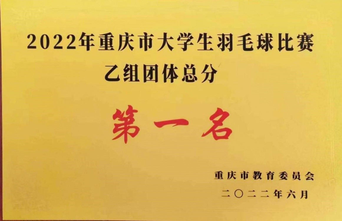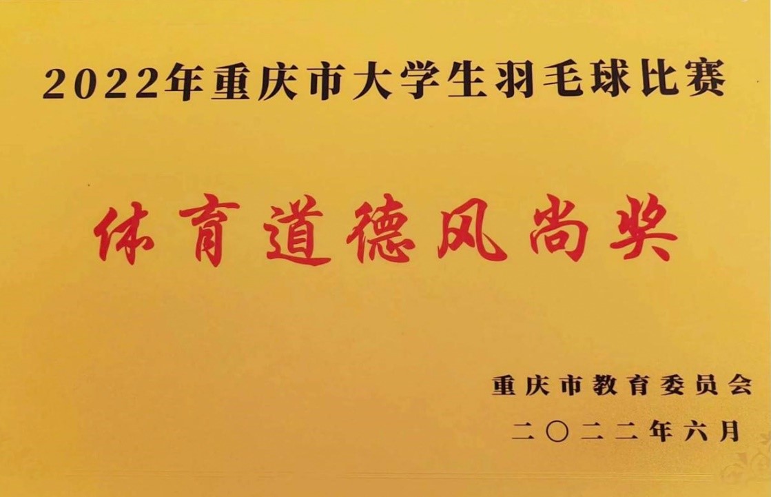 日前,学校羽毛球队学生陈佳豪、孙小平、胡峰、张悦、陈肇鸿、丁晓炜、张雨佳、胡广汶在教师黎志容的带领下荣获2022年重庆市大学生羽毛球比赛乙组团体第一名。学校荣获“体育道德风尚奖”称号。