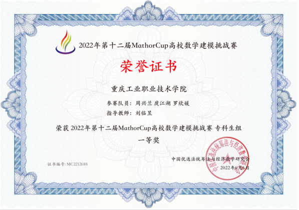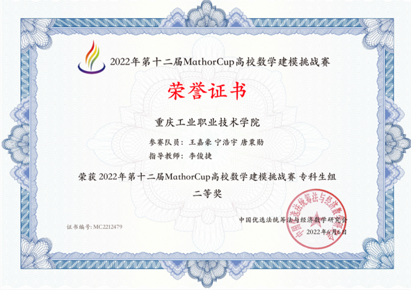 日前,学校轨道交通与航空服务学院师生在2022年第十二届MathorCup高校数学建模挑战赛中斩获佳绩。学院教师刘临昱指导的学生周兴兰、庹江湖、罗欣媛团队斩获专科生组一等奖;教师李俊捷指导的学生王嘉豪、宁浩宇、唐粟勋团队斩获专科生组二等奖。