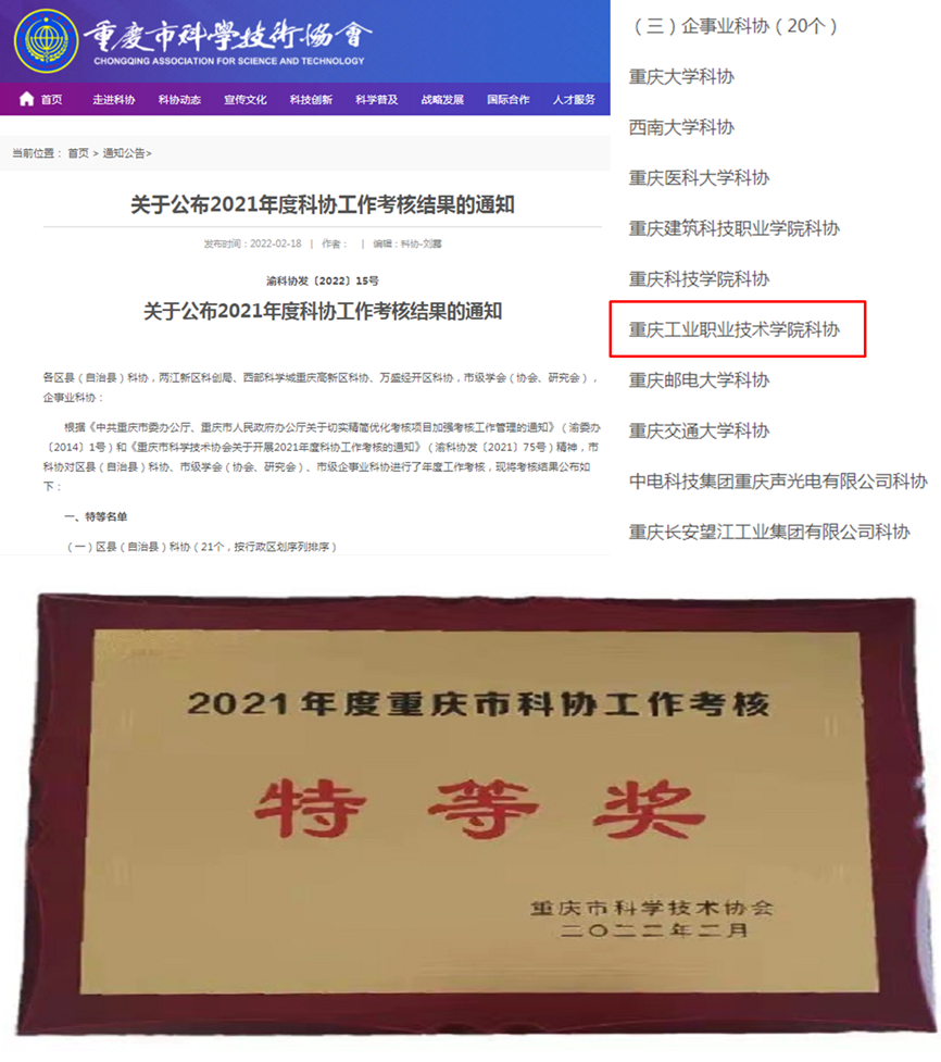 日前,根据重庆市科协《关于公布2021年度科协工作考核结果的通知》精神(渝科协发〔2022〕15号),学校科学技术协会荣获2021年度考核“特等奖”,全市公办高职院校中仅我校1所高职院校获此殊荣。