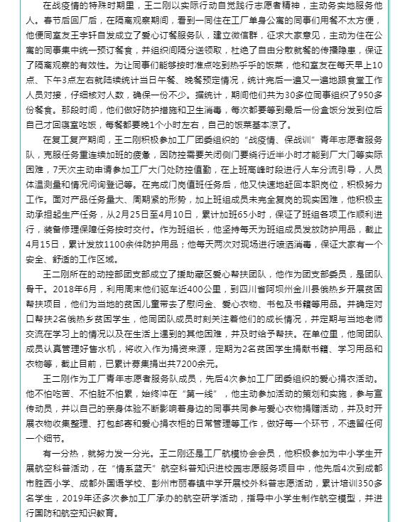 王二刚是动控部滑油箱修理班组长、动控部团支部委员。从2017年参加工作以来,尤其在今年新冠肺炎疫情防控和复工复产工作中,积极主动参加青年志愿者服务,表现突出。疫情期间,他自发成立爱心订餐服务队,为同住公寓的30多位同事集中统一预订餐食950余份。在复工复产阶段,积极参加工厂团委组织的“战疫情、保战训”青年志愿者服务队,主动申请参加工厂大门处防控值勤,在上班高峰时段进行人车分流引导,人员体温测量和情况问询登记等工作。面对产品任务量大、周期紧,班组成员未完全复岗的现实困难,他积极主动承担起生产任务,累计加班65小时,为班组成员发放防护用品1100余件,每天洒扫消毒2次,保证班组各项工作顺利进行,装备修理保障任务按时交付。