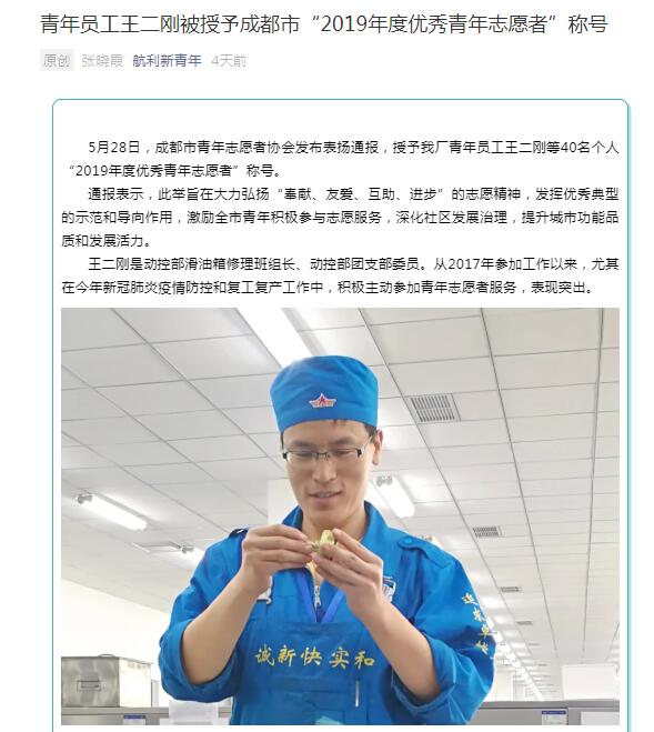 日前,学校2015届毕业生王二刚被成都市青年志愿者协会授予“2019年度优秀青年志愿者”称号。