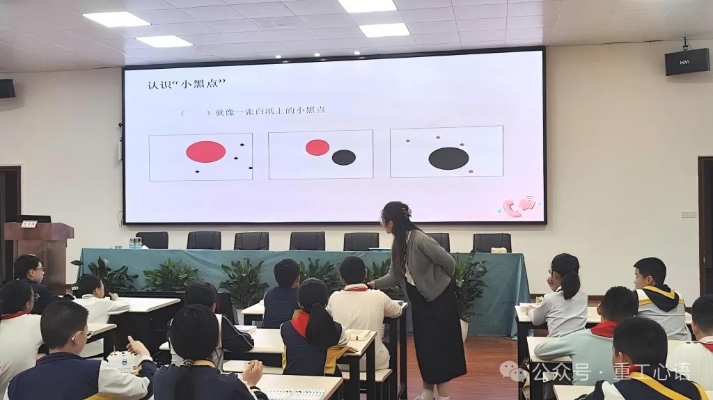 最后的环节是“心田花开”。孩子们依据先前的联想,在原本点缀着黑点的白纸上挥洒创意,让黑点神奇地“消失”,取而代之的是一幅幅色彩斑斓、生机勃勃的画面。