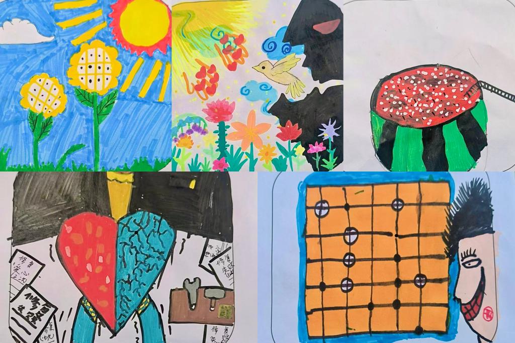 画作中,有的黑点化作了向日葵的葵花子,有的黑点化作了鸟儿的眼睛,有的化成了衣服的纽扣.....每一笔、每一划,都是孩子们内心世界的展现,是他们将挑战转化为机遇,将不足转化为独特之美的生动诠释。完成作品后,大家积极分享自己的作品及背后的寓意。
