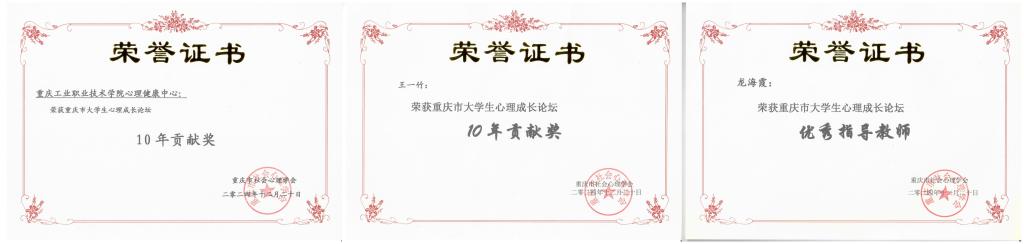 近日,由重庆市社会心理学会主办,重庆市大学生心理咨询与团体辅导专委会承办的“引领心理互助,启迪成长智慧”重庆市第十五届心理成长论坛评选结果公布,我校心理健康中心荣获10年贡献奖;专职心理教师王一竹、龙海霞分获个人10年贡献奖、优秀指导教师奖。