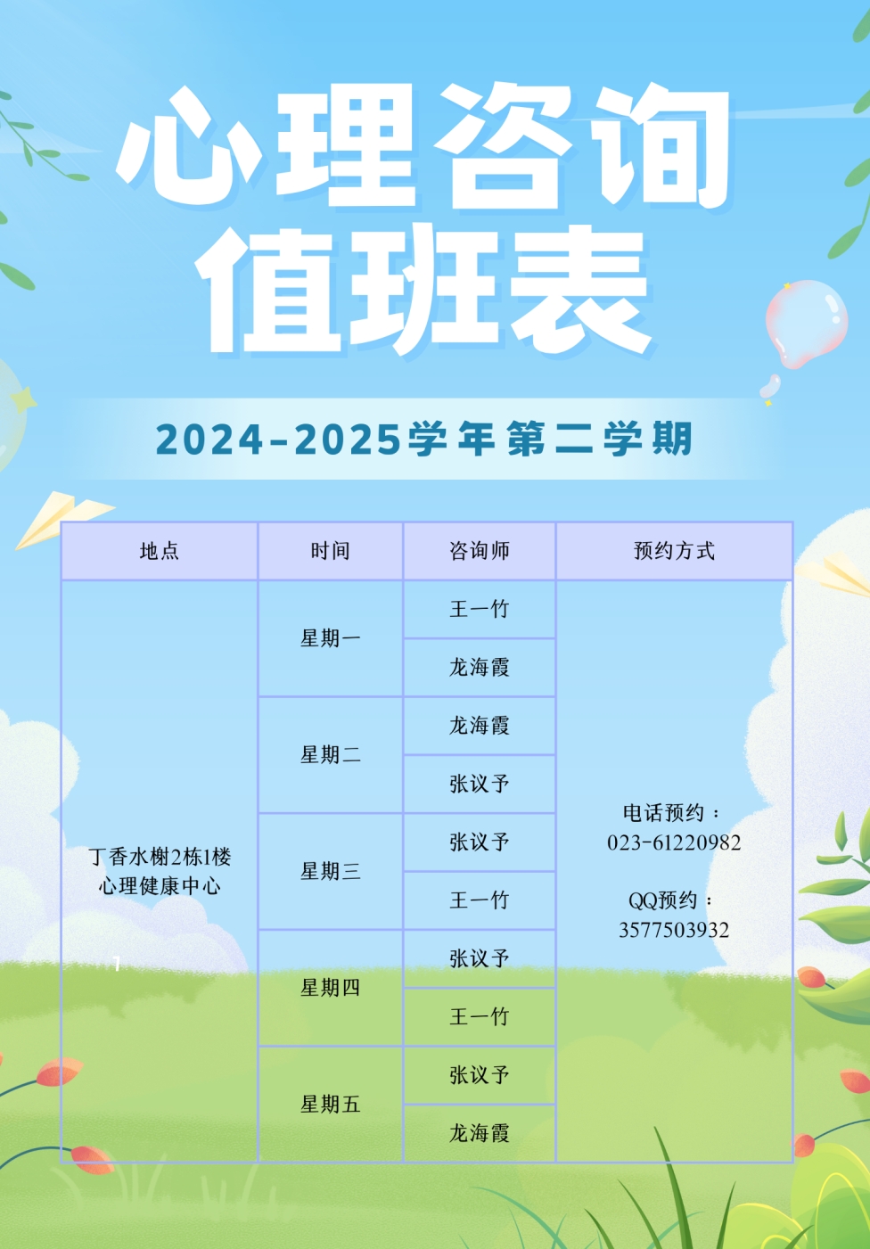 2024-2025学年第二学期心理咨询值班表